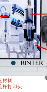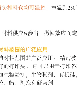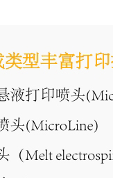适合打印:各种不需要加热的水凝胶,细胞、颗粒物凝胶(磷酸钙盐),适于构建各种支架、微型组织以及对材料的测试。