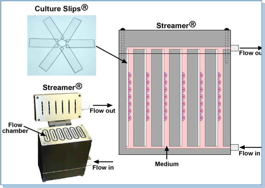The Streamer® is a parallel-plate flow system that is used to apply fluid-induced shear stress to cells grown in a monolayer. The system includes a six-chamber laminar flow device designed to hold 75 x 25 x 1 mm Culture Slips®. The Streamer® system can be used to apply laminar, pulsatile*, or oscillating* flow to cells. A computer-controlled peristaltic pump is used to regulate shear stress from 0-35 dynes/cm2. This six place flow chamber can be used for various biological assays including, but not limited to, the assessment of RNA and protein expression by cells in response to fluid-induced shear stress and production of secreted molecules into the perfusate.
