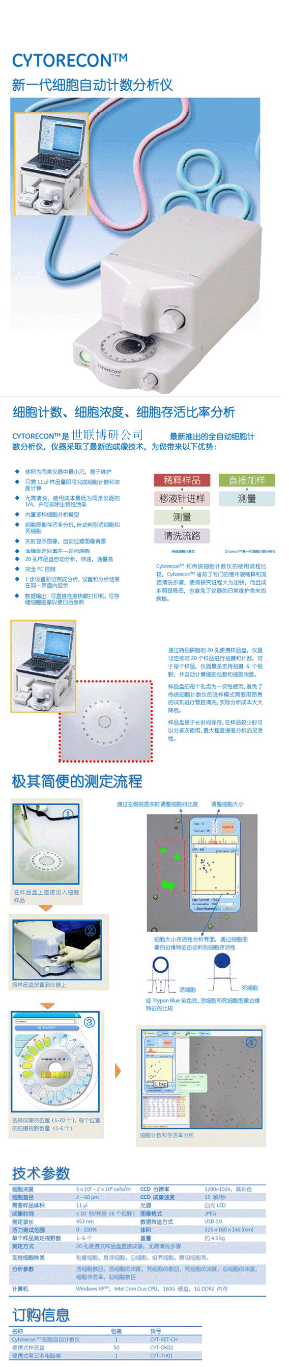 CYTORECON 作为新一代细胞计数分析仪,能快速自动进行细胞数量计算和细胞存活率分析,有效避免人为偏差。系统相比传统的细胞技术设备有着革命性地进化,是球shou台wu需任何试剂消耗和系统清洗的细胞计数仪,保证低的运行成本和系统稳定性。
