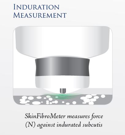 The SkinFibroMeter consists of a 1.25 mm length indenter, a reference plate and related built-in force sensors. The device is briefly pressed against the skin and the contact pressure is registered. The indenter imposes a constant deformation when the reference plate is in full contact with the skin. The skin and the underlying upper subcutis resist the deformation and the induration value in Newtons (N) is determined.