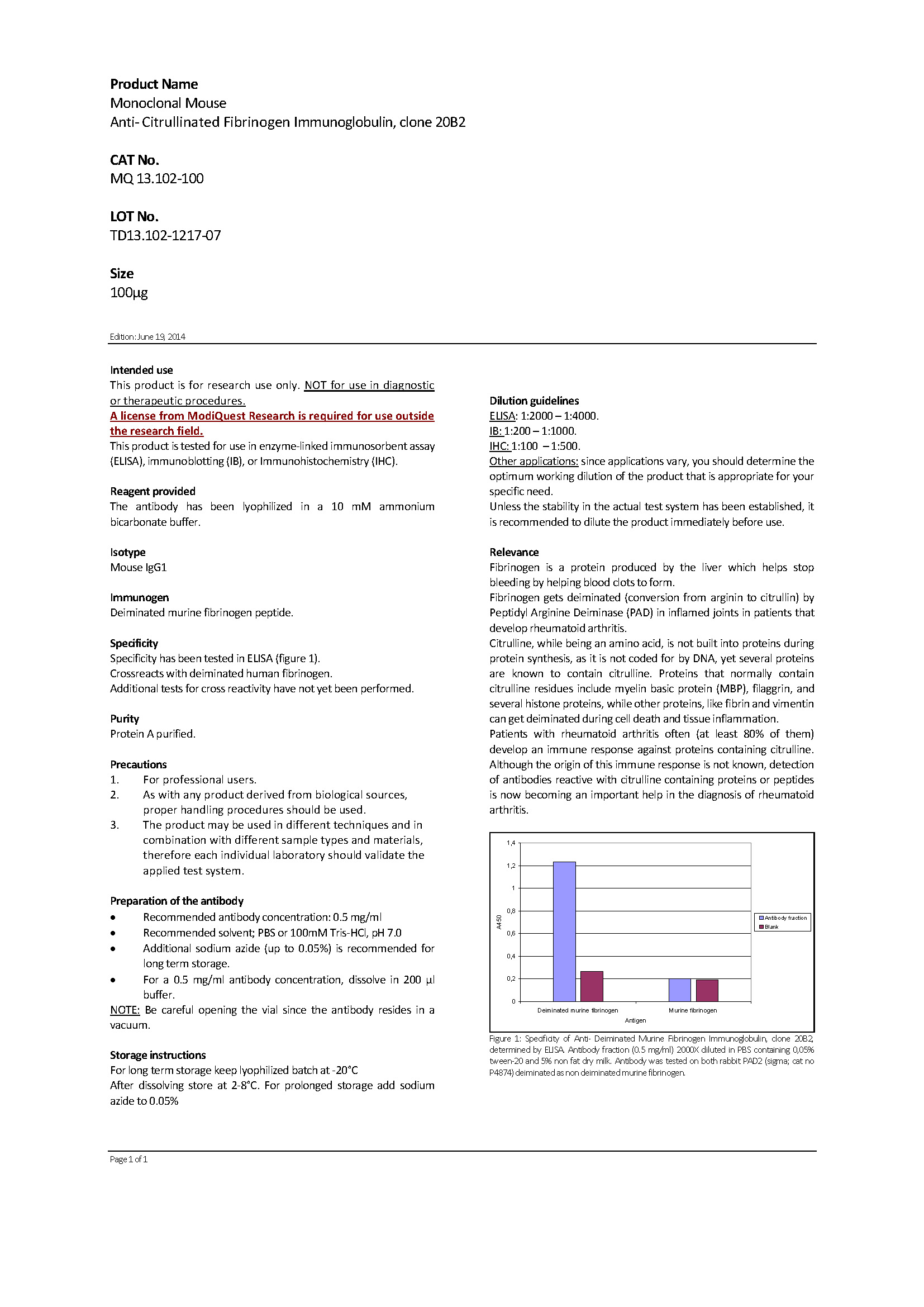 This product is tested for use in enzyme-linked immunosorbent assay (ELISA) or immunoblotting (IB) and immunohistochemistry (IHC). The antibody has been lyophilized in a 10 mM ammonium bicarbonate buffer, 100μg total. Mouse IgG1 isotype. For further reagent details, refer to the mouse anti-citrullinated fibrinogen monoclonal antibody product specification sheet (clone 20B2):