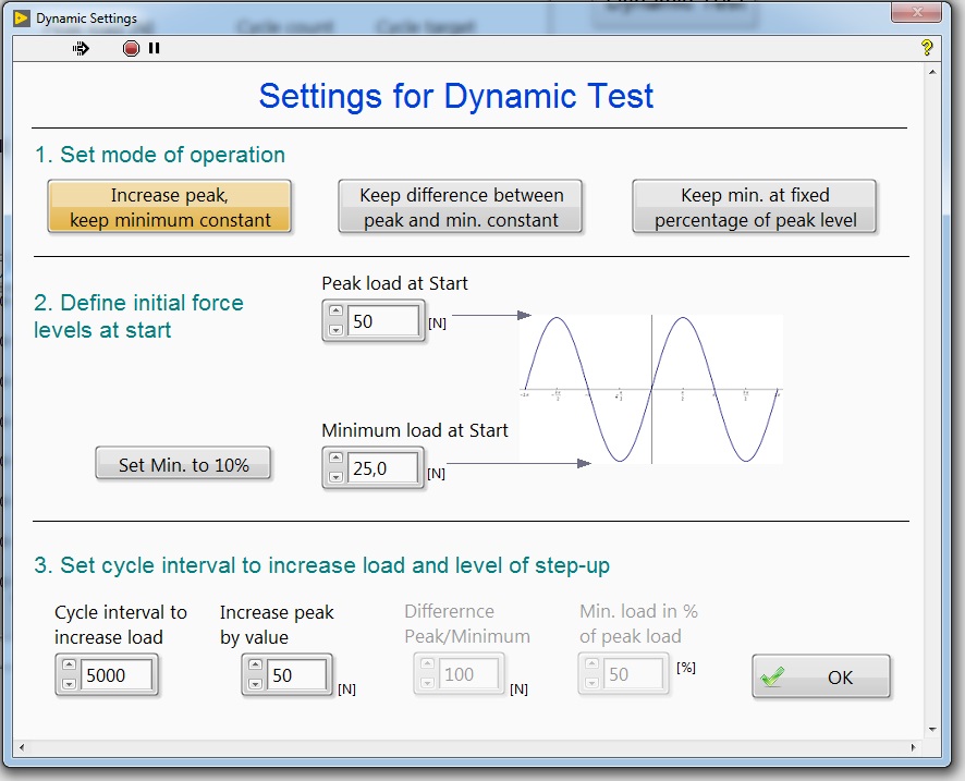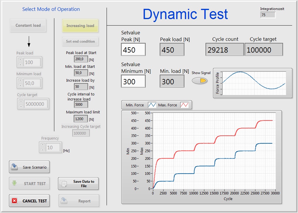 The maximum attainable load during static testing is 2kN. A sinusoidal force profile -with maximum and minimum limits that can be user defined- is available for dynamic testing. The load frequency ranges from 1Hz to 15Hz.