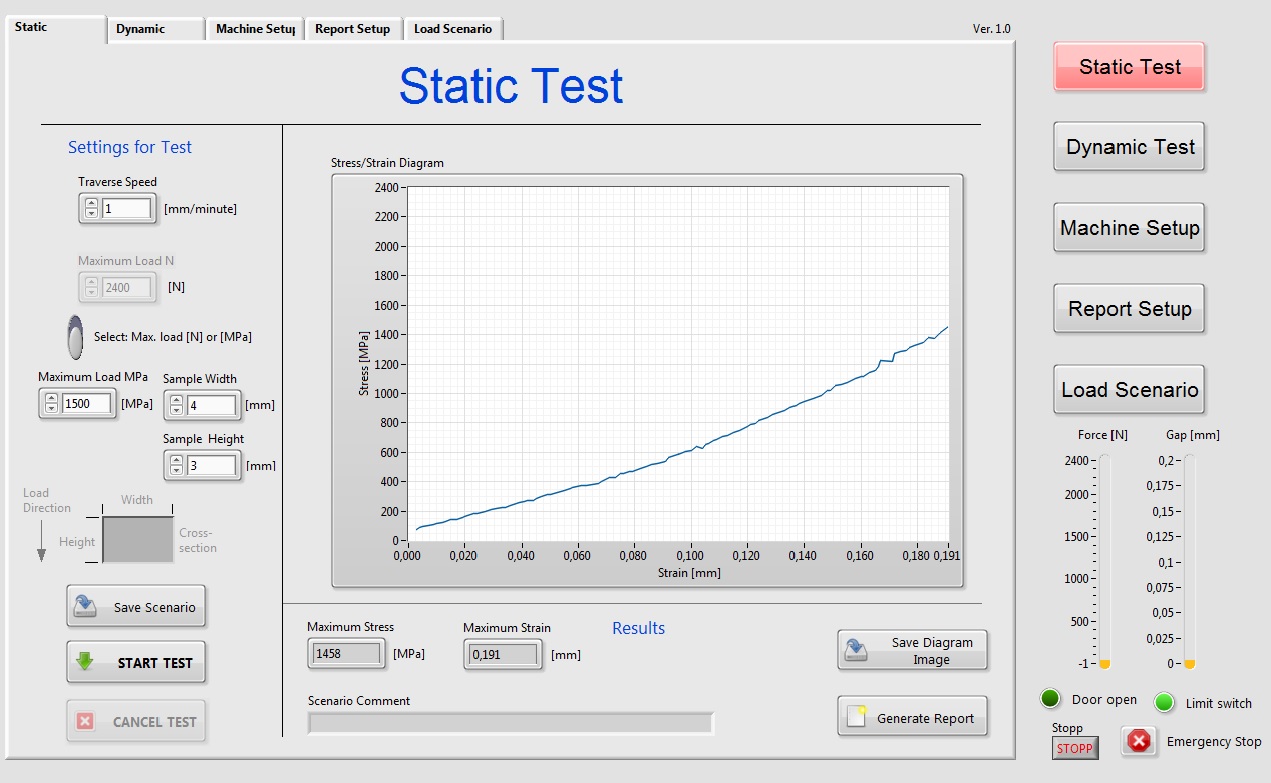Tests may be performed in dry environments or immersed into water. All relevant data is recorded during this process, such as the force progression depending on the number of cycles (staircase), as well as the tensioning/expansion or the force/path diagram. The integrated report function makes it easy to archive the results.