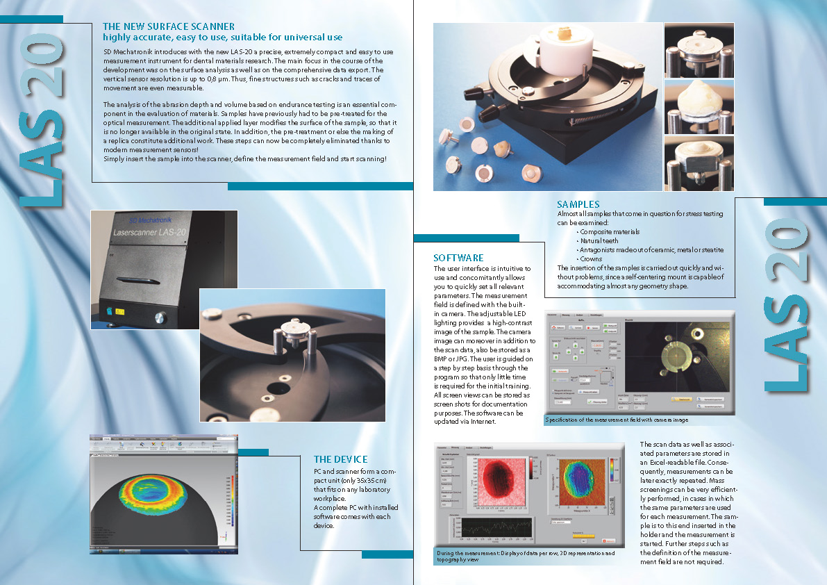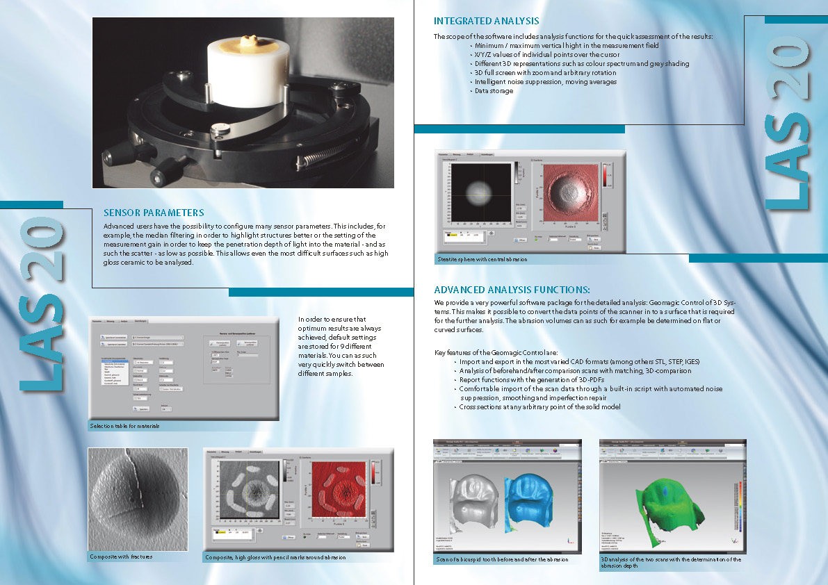 SD Mechatronik新型LAS-20是一种j确,紧凑且易于使用的牙科材料研究测量仪器。开发过程中的主要重点是表面分析和综合数据导出。该垂直传感器分辨率高达0.8微米。因此,诸如裂缝和甚至运动痕迹的精细结构可以测量。
