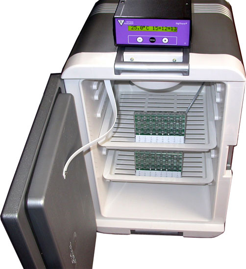 使用直径为5、7、10毫米的32个试管。可分别测量32个果蝇的活动节律,每个试管被红外光束一分为二,可实时检测果蝇从一端到另一端的来回活动。琼脂/蔗糖食品混合物被放置在试管的一端,后面是果蝇飞行区域,棉花塞放在试管的开口端,32个试管是集中插在监控架上的。