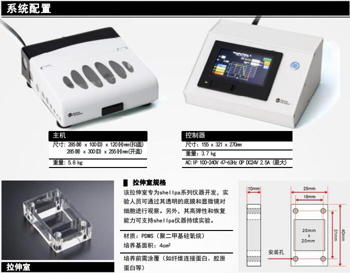 ShellPa由空气压缩机驱动,细胞贴附生长在硅胶腔室的底部,相对于静止状态的拉伸,细胞可受到更多的生物和物理的刺激。此外,拉伸频率和拉伸比可根据不同的应用环境调节。