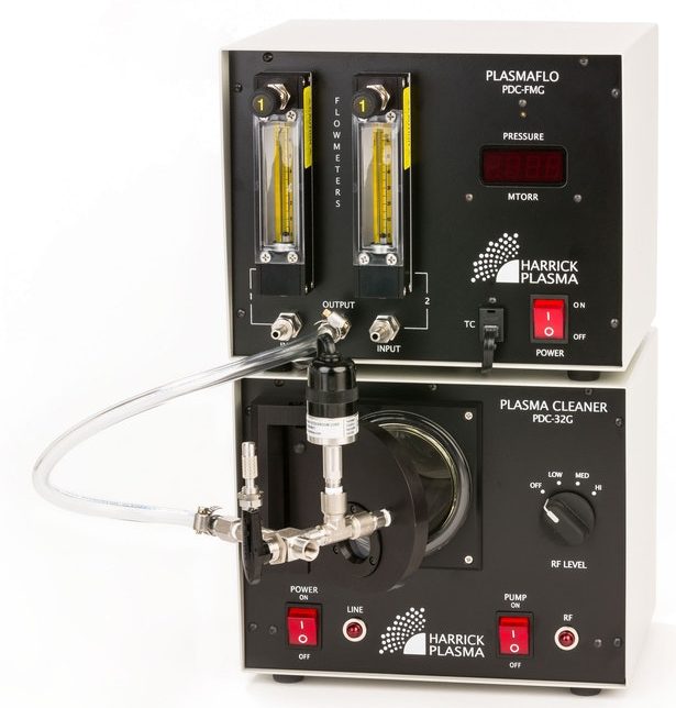 等离子清洁器配有真空泵和监测真空压力的气流混合器。