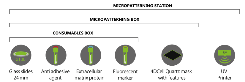 该细胞微环境微图案套件包括您在玻璃片上制作自己的粘合剂微图案所需的一切,价格合理。