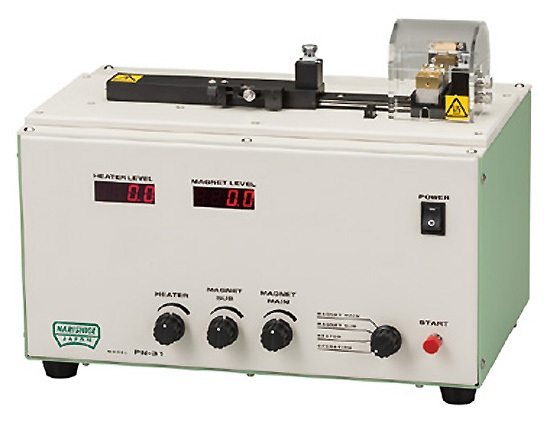 水平拉针仪采用电磁力的拉伸作用方法对直径1-1.2毫米的硼硅玻璃毛细管拉伸。更长的抽取体积和强力电磁线圈的采用使得拉制仪可以制造出更尖长的微型针状物。拉伸张力可以在很宽的范围内调整,从开始阶段逐渐拉伸毛细玻璃管的微弱张力,到生产细长微型针状物所需的单次拉伸伸长方法用到的强张力。加热器采用了能够迅速变热的铂板,因此拉伸可以立即开始,不会有时间延迟。PN-31水平拉针仪的屏幕上可以显示数字值,其中100表示电磁铁和加热器的输出值,这使得大量生产质量均一的微型针状物变得更加简单。