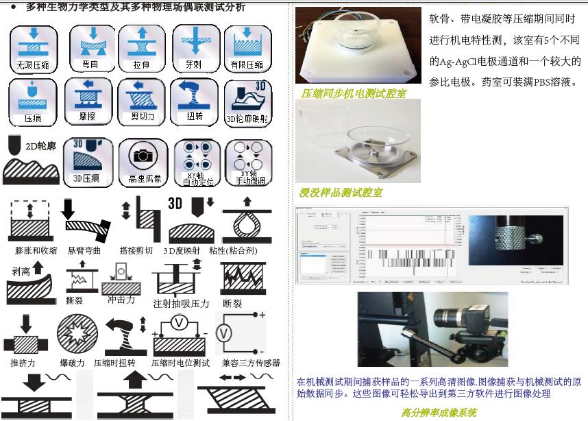 该系统是能集成模块化压缩、张力、剪切、摩擦、扭转和2D/3D压痕、3D轮廓及多力混合耦连测试的一体化微观力学测试装置。能对生物组织、聚合物、凝胶、生物材料、胶囊、粘合剂和食品进行精密可靠的机械刺激和表征。允许表征的机械性能包括刚度、强度、模量、粘弹性、塑性、硬度、附着力、肿胀和松弛位移控制运动。