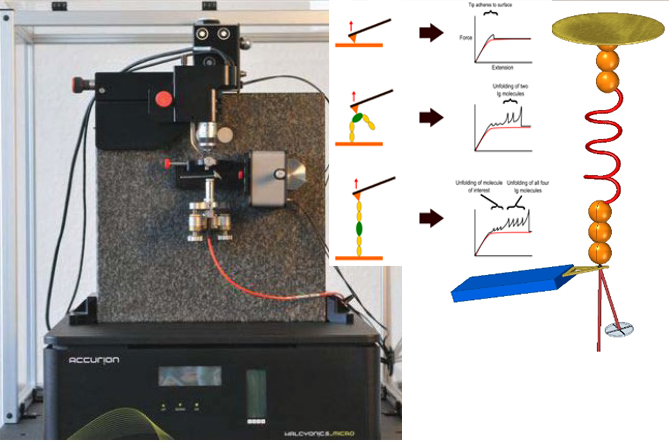 This unique Atomic-Force-Spectroscope (AFS) , based on the Atomic Force Microscope Technology (AFM) was specially designed for studying single proteins placed under a calibrated mechanical load.