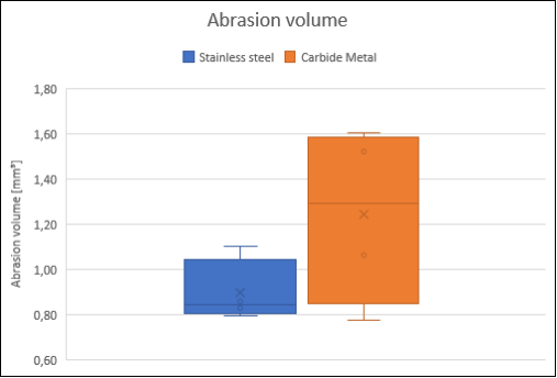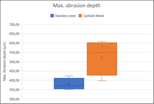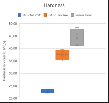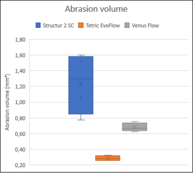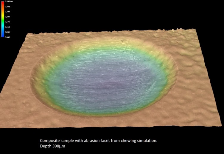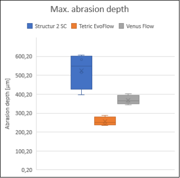 在Voco Structur 2 SC扁平试样上,使用四个不锈钢圆锥体和四个硬质合金圆锥体作为拮抗剂。在蒸馏水中,以50N进行240,000个在咀嚼模拟循环后(相当于体外约1年),测量硬度,磨损量以及大深度。