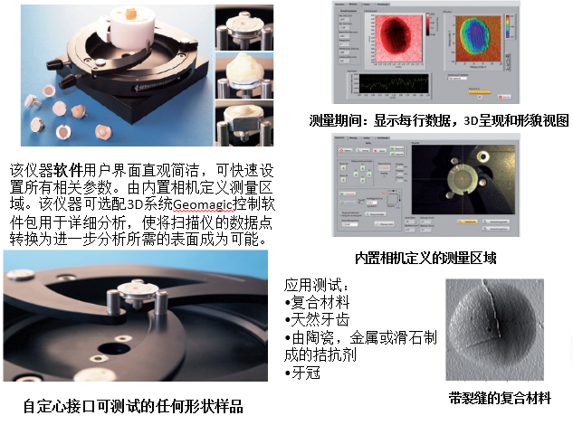 是一款体积小、精度高、易使用、通用性强的口腔材料表面测量仪器,只需插入样品,定义测量区域,wu需其它额外工作便可开始扫描!该仪器着重于表面分析和综合数据导出功能。垂直传感器分辨率可高达0.8微米,因此,诸如裂缝和运动痕迹等细微结构都可清晰分辨。