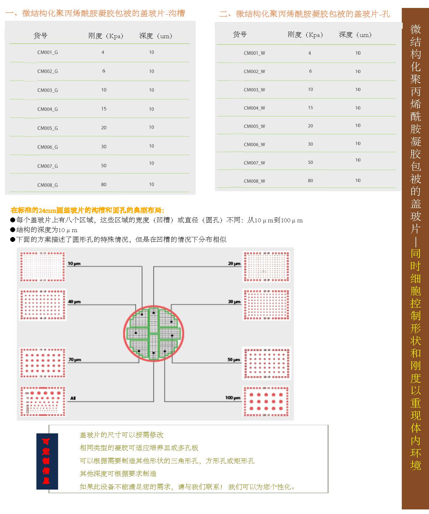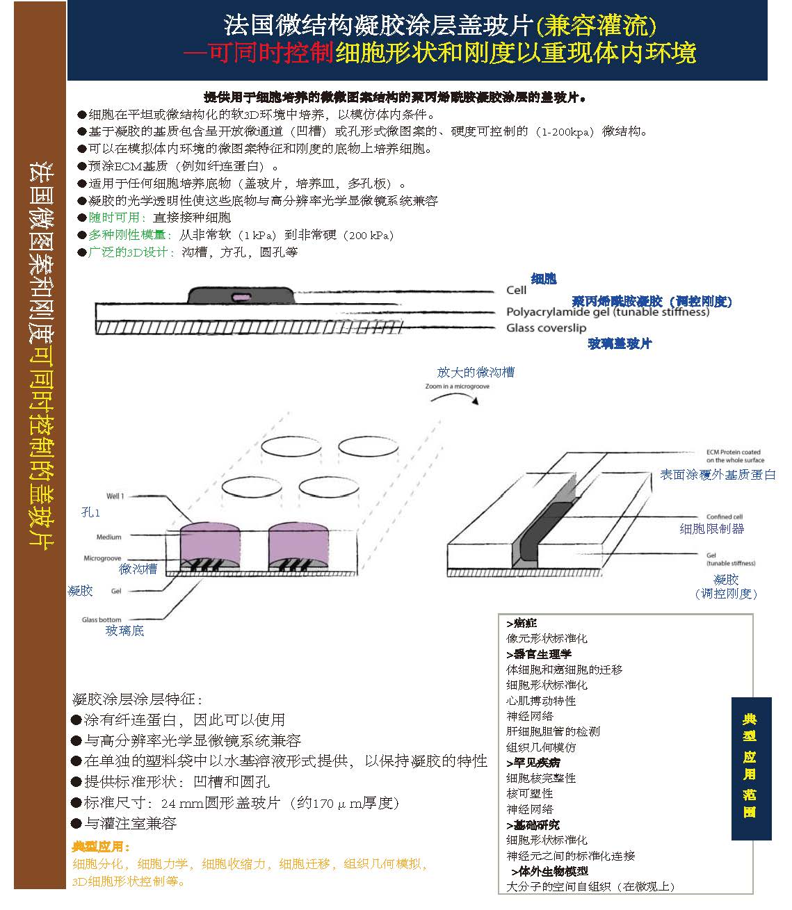 基底微图案纳米表面,该图案具有亚微米对齐的凹槽,并且其硬度可调节(0.1-80kpa)。 微图案有助于形成排列的细胞单层,使它们具有结构排列和组织性,从而使细胞更加成熟和生理地表达。
