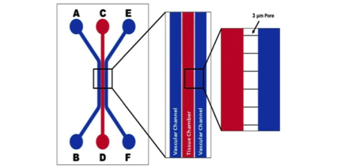 用于在内皮细胞和上皮细胞之间形成气液界面的设备示意图。 空气(或上皮)通道通过微制造的多孔结构与双流体(基底外侧)通道隔开。 右图显示从顶部和横截面视图看时细胞的定向。