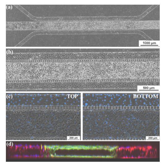 微流控芯片中的上皮和内皮共培养。 (a)和(b)融合共培养芯片的相衬图像,中心通道上皮细胞,周围通道内衬内皮细胞。 (c)通道顶部和底部的相衬,显示组织和血管通道中汇合的单层。 这些图像显示了中央通道顶部和底部以及一侧通道的细胞汇合处的中央透明管腔。 (d)共培养芯片的3-D重建共聚焦横截面图像,显示了三个通道中的管腔形成(10倍放大)。 摘自Liu et al 2019。