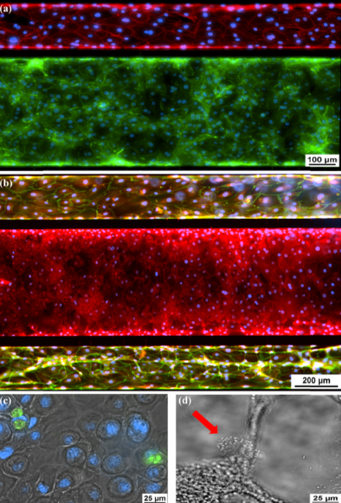 分化的上皮细胞和内皮细胞的免疫荧光。 (a)Ecadherin(绿色),上皮细胞粘附素蛋白。 VE-钙黏着蛋白(红色),内皮细胞黏附蛋白。 (b)ZO-1(红色)染色中央通道上皮细胞的紧密连接,以及血管通道的VE-钙黏着蛋白染色(绿色)。 (c)Muc5ac(绿色),上皮细胞内部的细胞内粘蛋白染色。 (d)有红色箭头指示的纤毛上皮细胞。