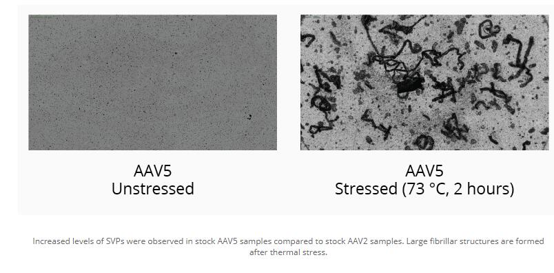 与库存AAV2样品相比,在库存AAV5样品中观察到SVP含量增加。热应力后形成大的原纤维结构。