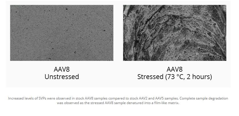 与库存AAV2和AAV5样品相比,在库存AAV8样品中观察到SVP含量增加。随着应力的AAV8样品变性成膜状基质,观察到样品wanquan降解。