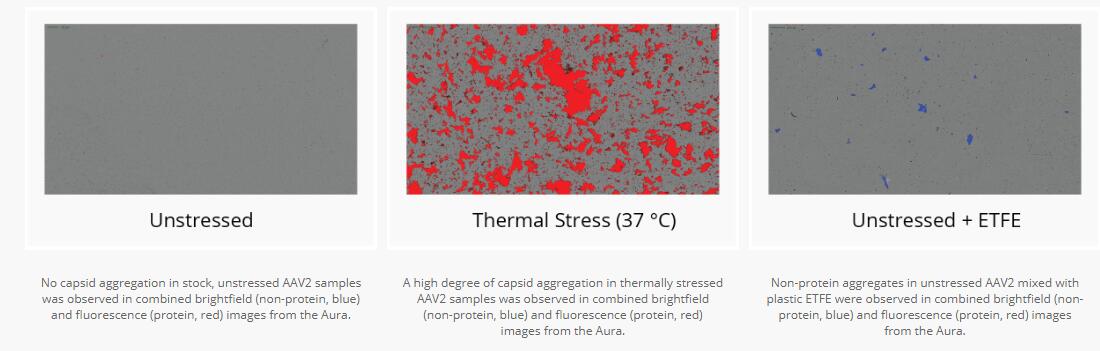 在来自Aura的组合明场(非蛋白质,蓝色)和荧光(蛋白质,红色)图像中,观察到热应激AAV2样品中衣壳高度聚集。