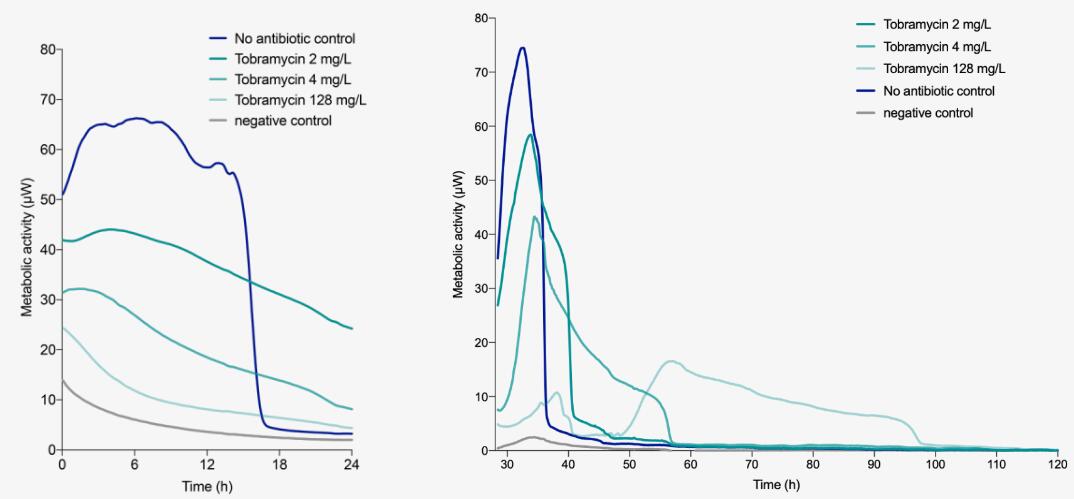 使用该系统,您可以查看时间杀灭测定法中通常使用的cfu计数背后的数据。 如以下用美罗培南治疗大肠杆菌所显示的,我们可以很快看到随着时间杀灭的前几个小时新陈代谢减少而产生的抗菌素浓度的作用,可作为时间杀灭结果的预测指标。 除此之外,该系统可以连续且实时地收集时间杀灭数据,这意味着wu需费时的重复采样即可干扰您的实验。
