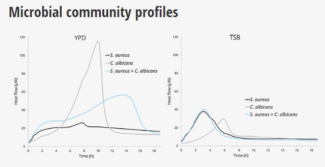 混合培养物的热流曲线可以根据培养基选择和不同生物的相互作用而变化。 可以计算出微生物群落的累积能量释放,并且可以轻松得出混合培养物与单个生物的代谢曲线之间的比较。
