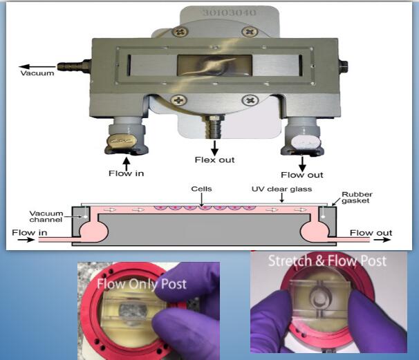 A parallel plate laminar shear stress device that allows the user to observe signaling responses to fluid flow and/or apply strain (up to 4%) to cells before, during, or after applying a shear stress.