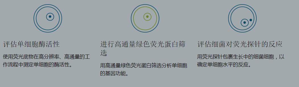 使用该系统封装单个小细胞,包括微生物和藻类,以及生物活性分子。我们高度稳定的双乳化液滴提供了一种方法,可以孵育单个活细胞进行分析,并对它们进行分类,以在基于细胞的工作流程中获得高分辨率。在封装细胞核方面也有良好的表现,其他细胞器的工作流程正在测试中。