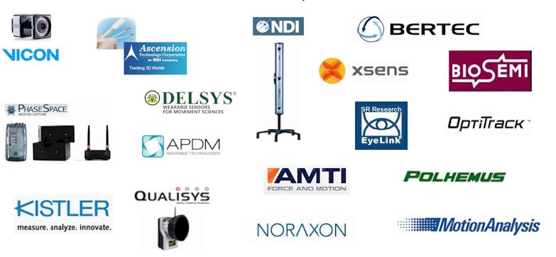 各种捕捉相机、位置跟踪器、EMG(肌电图)、测力台、仪器式跑步机、仪器式楼梯、手传感器、EEG脑电图、定量脑电图(quantitative EEG,qEEG)系统、数字视频、事件标记和其他模拟设备、虚拟现实和触觉设备等等。