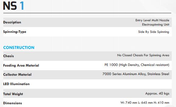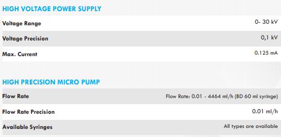 NS1模型包括静电纺丝操作所需的基本组件:注射泵、高压电源和收集器部件。可以精度地施加高电压以及调节流速和针与收集器之间的距离。
