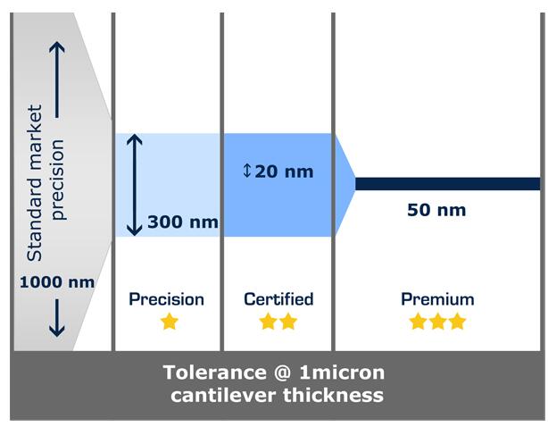 Duo-/Octosensis 微悬臂阵列是具有单晶硅悬臂的芯片。这些悬臂梁传感器可用于静态和动态模式。因此,传感器可提供 1um 和 5um 的悬臂厚度。每种厚度有 3 种不同的长度可供选择:500um、750um 和 1000um。