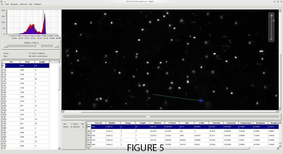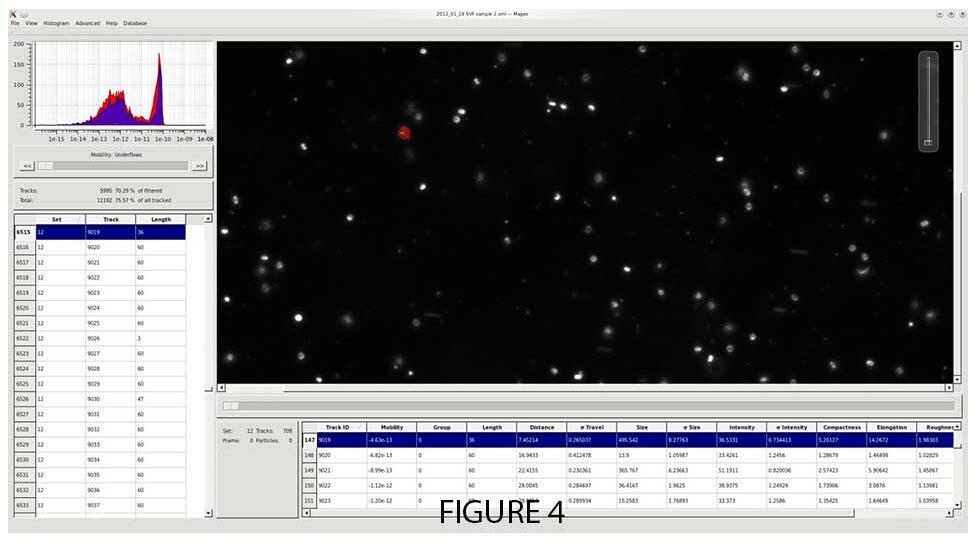 该测速仪的操作员可以查看由高清摄像机创建并存储在内存中的all图像(图4),而该系细胞测速系统软件可以计算并显示粒子的迁移率的直方图,其速度是在框架下测量的。 帧(图4,左上方)。