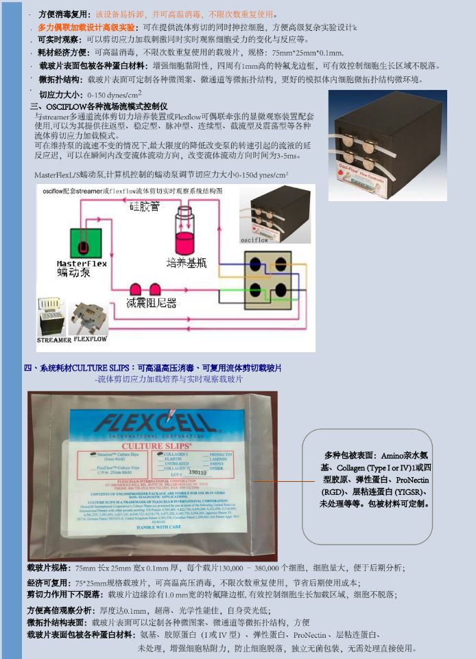 美国flexercell品牌str-4000流体剪切力系统(细胞剪切力、细胞流体剪切应力、细胞剪切应力、流体切应力、层流剪切应力、细胞切应力)系统,4000多篇文献,国内260多家单位成功使用,、wu使用风险。 1)、同一个流体剪切力加载培养设备具有不少于六个通道,腔室是稳重的钛合金材质,在每个通道可以放入规格不小于25 x 75 x1.0mm的细胞培养载片,培养腔室设备易拆卸并可高温消毒, 细胞培养载片边缘要涂有1.0 mm高的特氟隆边框,可以有效控制细胞生长在切应力加载区域,有效防止流体剪切力的液流流过时细胞脱落,可升级流体应力和拉伸力同时混合加载刺激细胞,并可实时观察细胞在流体剪切应力或混合力作用下实时变化和反应。 ★2)、流体剪切力加载细胞培养载片表面可提供五种不同包被的培养表面:Amino, Collagen (Type I or IV) Elastin, ProNectin (RGD), Laminin (YIGSR)和未处理的培养表面供用户任意选择,不同包被的培养表面提高细胞的贴壁与生长,细胞培养载片wu菌du立包装,使用时wu需消毒处理。 3)、配置蠕动泵和医用级别的阻尼器,计算机流体剪切控制软件系统可控制蠕动泵可以调节切应力大小从0-35 dynes/cm2,用户可通过控制软件自定义细胞流体剪切应力的用户名称、实验方案、受力大小、力加载频率、力加载周期和流场类型及各种模拟波形。医用级别的阻尼器可以消除液流气泡,使液流更平稳。 4)细胞量大,便于后期分析:每个载片130,000 – 380,000 个细胞,便于后期分析细胞中基因的表达(mRNA检测),以及使用流式细胞仪、基因芯片等进行分析。 |
