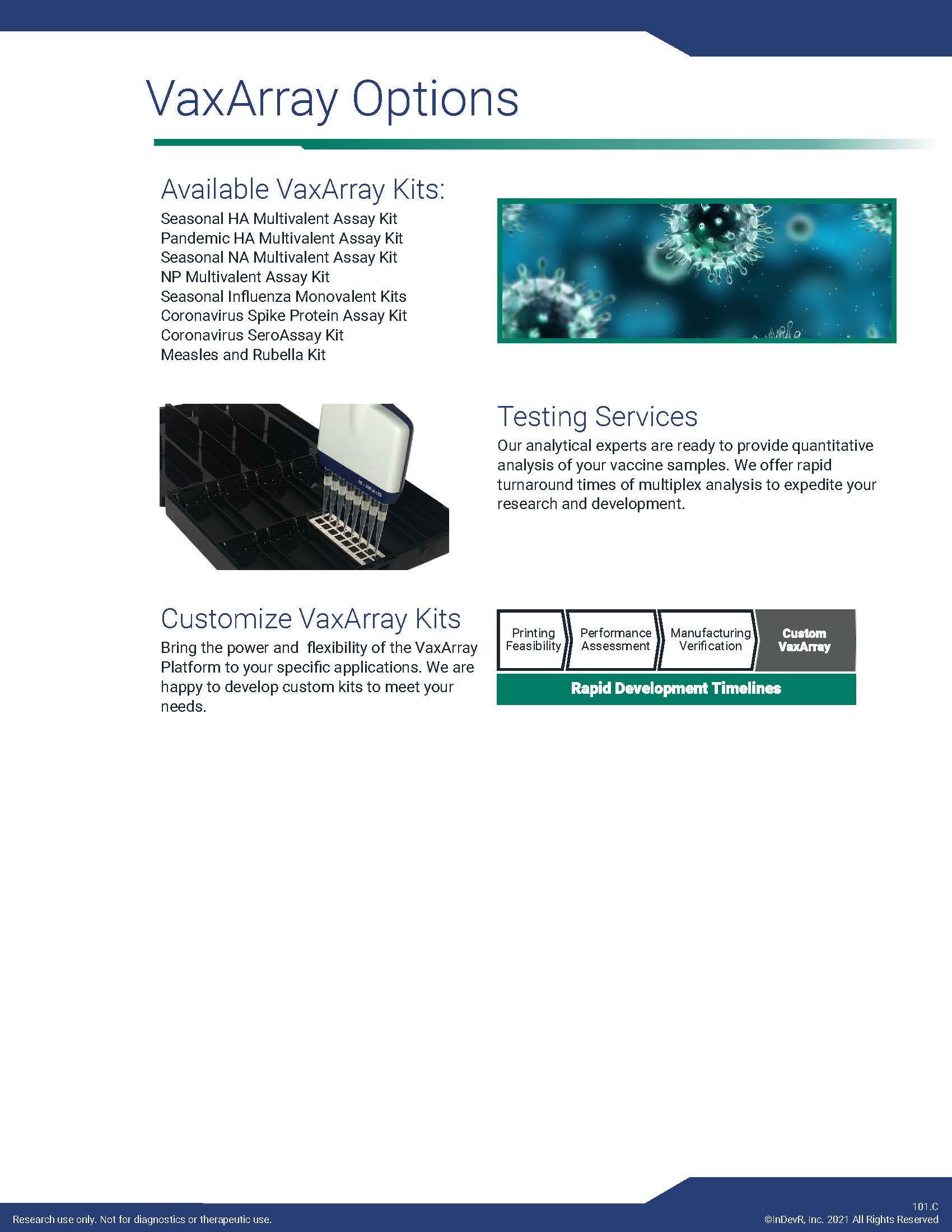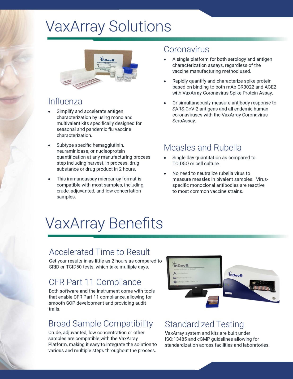 VaxArray 平台是美国 InDevR 公司生产研发的一个简单易用的系统,该平台使用多种现成的试剂盒,通过对微阵列的快速、高分辨率的成像分析,可以实现在单个平台上,对多种疫苗实现从临床功效,疫苗稳定性及疫苗效力等多方面的应用分析。VaxArray 是疫苗生产商灵活而强大的工具,可以为疫苗生产和流程you化方面提供巨大帮助。 VaxArray?应用 新冠病毒 用于疫苗开发的抗原或抗体反应的量化。SARS-CoV-2 大流行和地方性毒株的多重测量。 麻疹和风疹 当天抗原定量。分析单价麻疹、单价风疹或二价疫苗样品。 脊髓灰质炎病毒 血清型特异性和稳定性表明脊髓灰质炎病毒抗原定量。只需 1 小时即可获得结果。 流感 简化和加速抗原表征。用于对流感疫苗进行可靠的亚型特异性定量的单价和多价试剂盒。 肺炎球菌 标准化 CQA 检测试剂盒,用于对高度多价药物产品进行快速、灵敏的鉴定、数量和稳定性检测。在单次测定中分析多达 23 种多糖血清型。