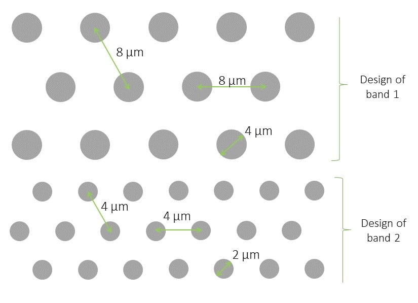 设计带1:直径为4um; 中心到中心的距离为8um