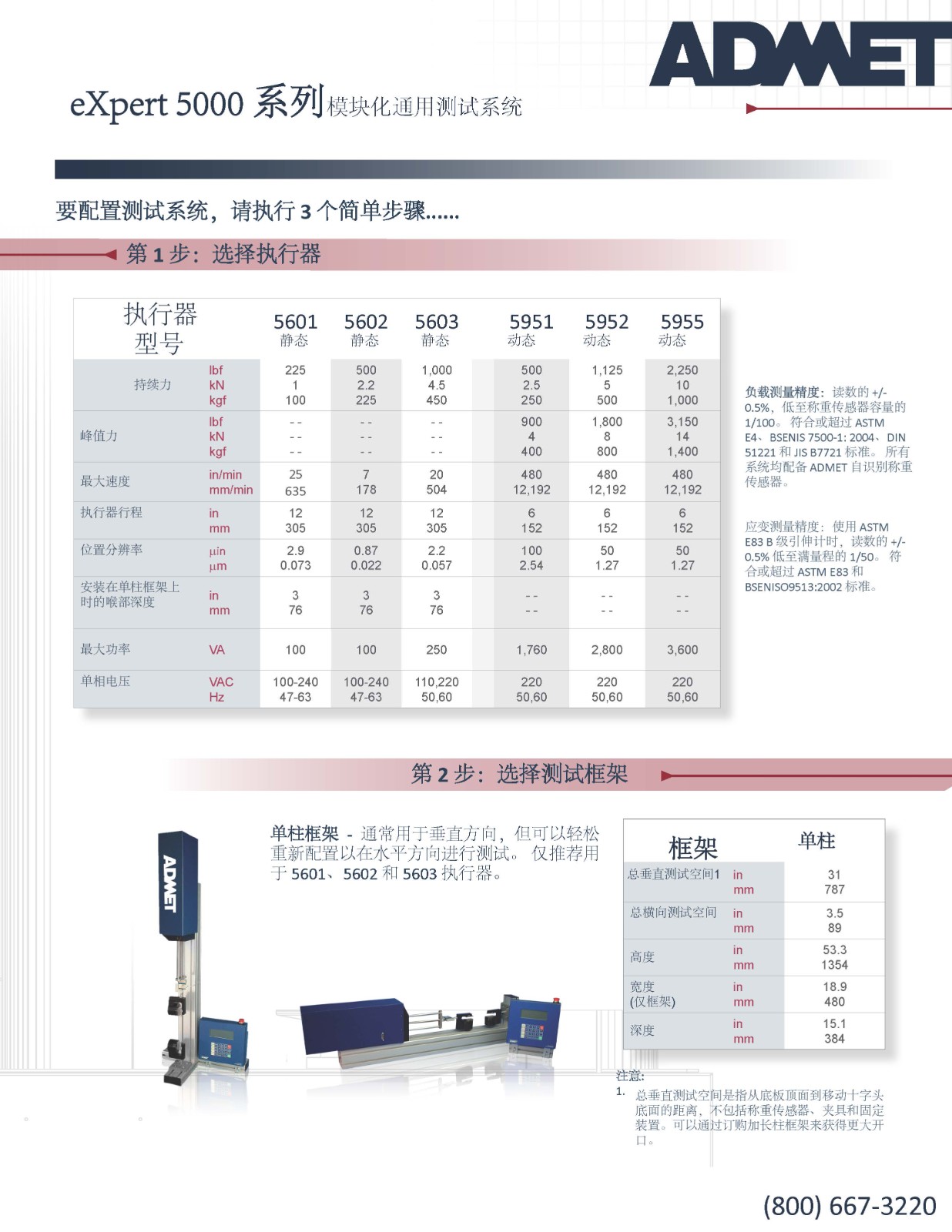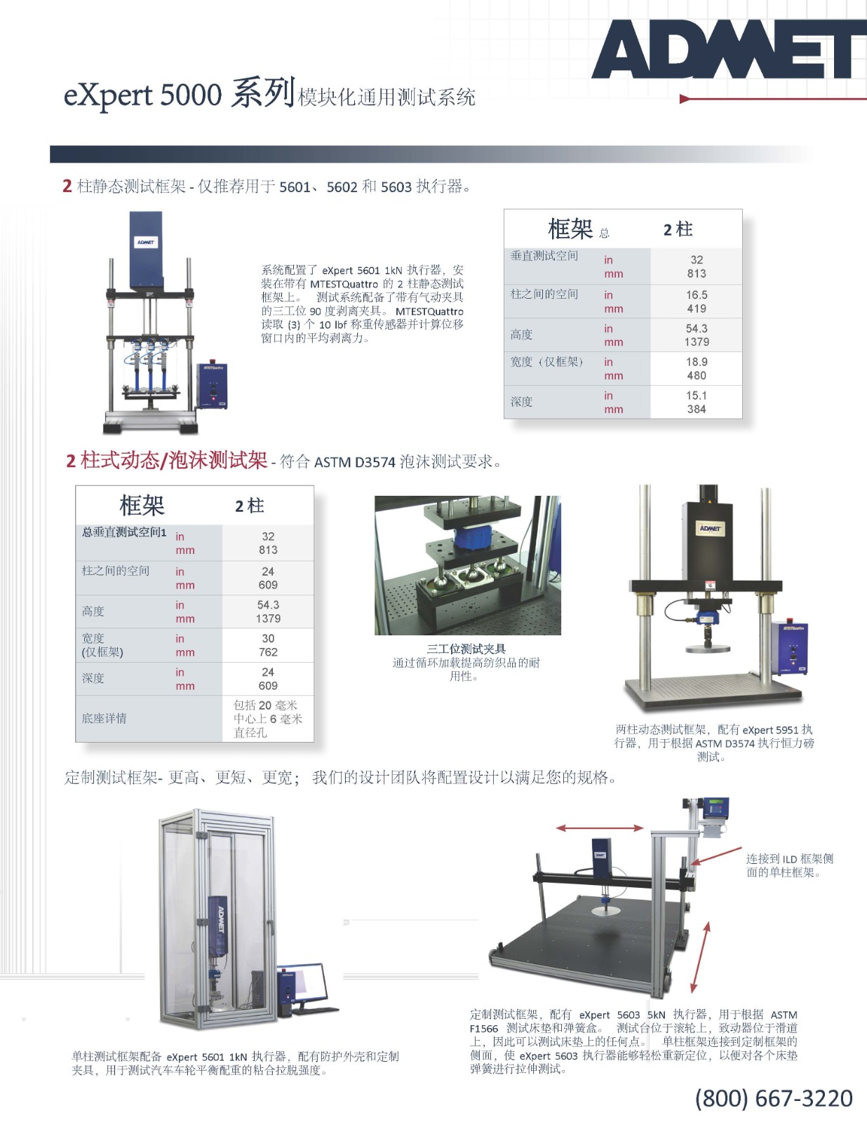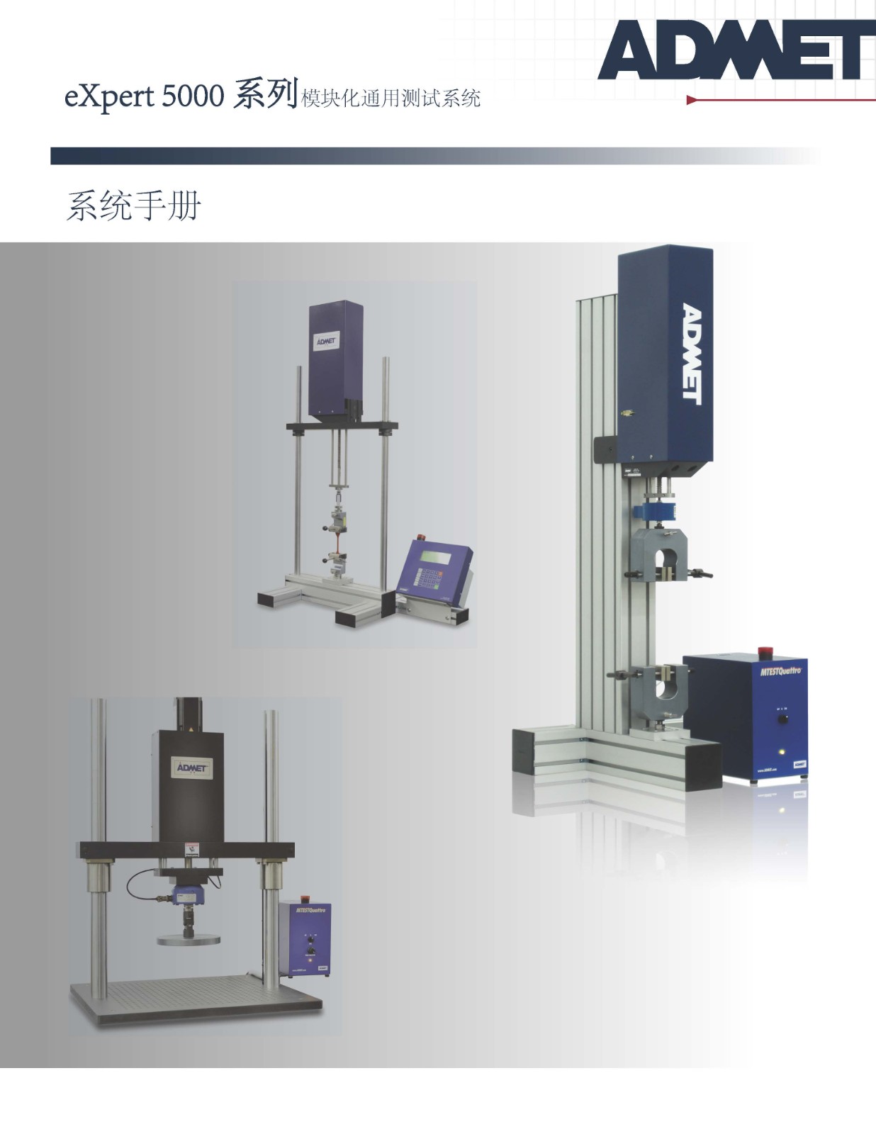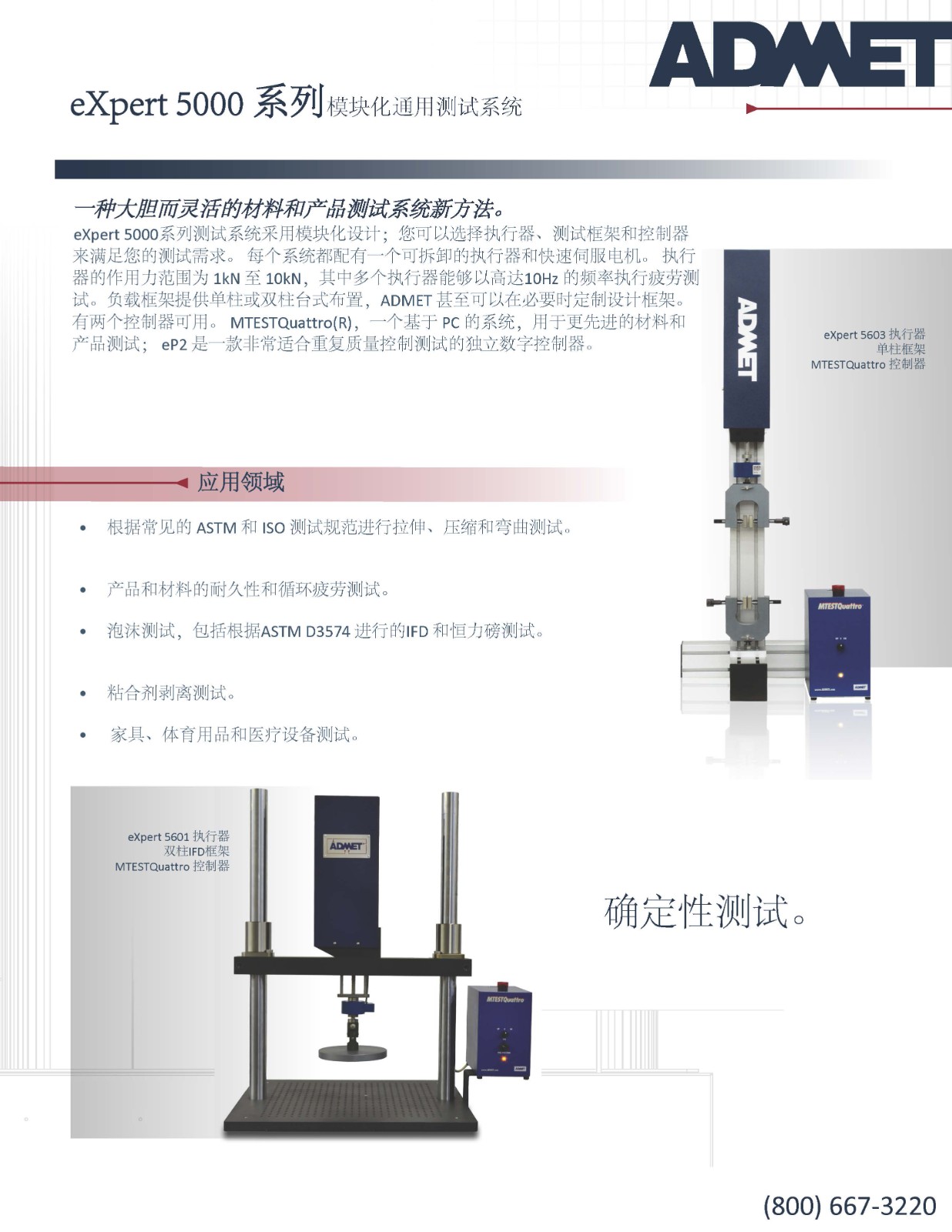 eXpert 5000 系列模块化通用测试系统 eXpert 5000系列测试系统采用模块化设计;您可以选择执行器、测试框架和控制器来满足您的测试需求。 每个系统都配有一个可拆卸的执行器和快速伺服电机。 执行器的作用力范围为 1kN 至 10kN,其中多个执行器能够以高达10Hz 的频率执行疲劳测试。负载框架提供单柱或双柱台式布置,ADMET 甚至可以在必要时定制设计框架。 有两个控制器可用。 MTESTQuattro(R),一个基于 PC 的系统,用于更的材料和产品测试; eP2 是一款适合重复质量控制测试的立数字控制器。 其结果是一个灵活的模块化系统能够执行各种测试。