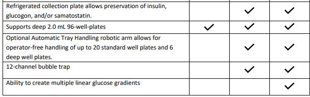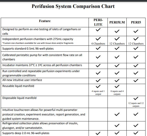 // 特征 PERI5 的新功能: ? 新型一次性微流控歧管 ? 能够使用 12 种不同的输入源解决方案 ? 能够并行运行 12 个不同的腔室 ? 能够创建多个线性葡萄糖梯度 ? 12 通道气泡捕获器 ? 新的直观用户界面 BENEFITS + FEATURES: ? Designed to perform in-vitro testing of islets of Langerhans ? 12 independent perifusion chambers hold 20 to 100 islets ? Supports standard or deep 96-well-plates ? Peristaltic pump for calibrated and equal flow rate on all 12 chambers ? Incubator maintains 37°C +/- 1°C across all perifusion chambers ? Refrigerated collection plate allows preservation of insulin, glucagon, and/or somatostatin ? Run controlled and repeatable perifusion experiments under programmable condons ? Patented microfluidic manifold supports up to 12 input solutions x 12 output channels to achieve 144 different routing scenarios in any one experiment ? Intuve touchscreen allows for powerful multi-parameter protocol creation, experiment execution, report generation, and guided system maintenance ? Optional Automatic Tray Handling robotic arm allows for operatorfree handling of up to 20 standard well plates or 6 deep well plates |
