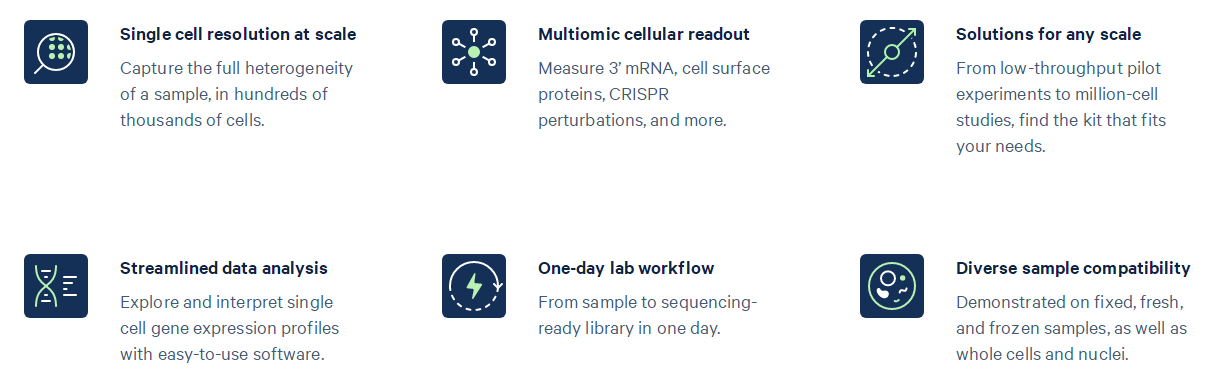 Reveal the full complexity of cellular diversity, cell by cell Chromium Single Cell Gene Expression provides single cell transcriptome 3' gene expression and multiomic capabilities to profile tens of thousands of cells. Explore cellular heterogeneity, novel targets, and biomarkers with combined gene expression, surface protein expression, or CRISPR edits in each cell.