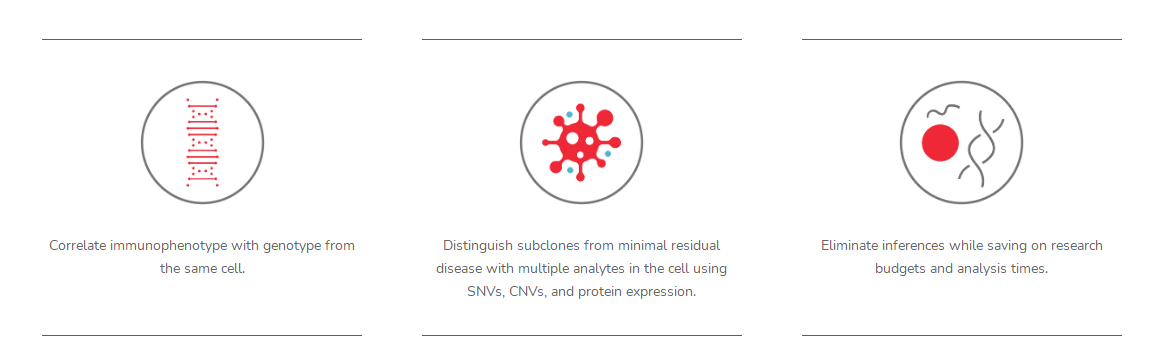 Cancer is a complex disease with a mix of cells with varied states, and understanding of the disease state at the cellular level is required for better therapies. A single-cell multi-omics approach is the only way to achieve full resolution, revealing the complex interplay between genotype and phenotype. Perform true multi-omics with simultaneous detection of SNVs, CNVs, and protein at the single-cell level.