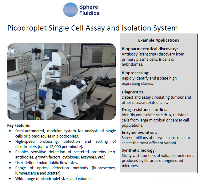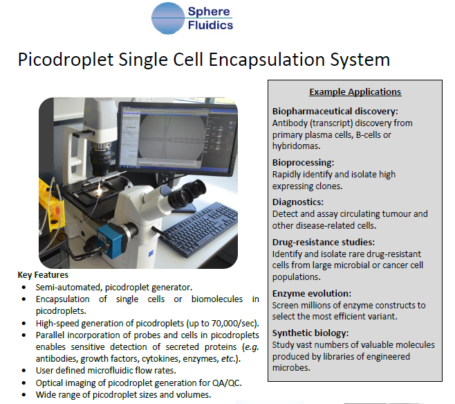 • Picodroplet Single Cell Encapsulation System (Sphere Fluidics Limited,United Kingdom)