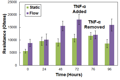 Modulation of Inflammation responses in SynBBB model. TNF-alpha induced leakiness in the BBB measured by changes in the resistance across the endothelial cells. Removal of TNF-alpha followed by media perfusion under physiological flow conditions enables recovery of the tight junction leading to increased tight junction formation. Static cells maintain a constant resistance due to lack of tight junctions.