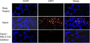 Immunohistochemical detection of myeloperoxidase (MPO) in representative lung tissue sections from 24 h post surgery.  Few MPO-positive cells in Sham surgery. Sepsis induces the infiltration of numerous MPO-positive cells throughout the lung parenchyma. PKCδ-TAT Inhibitor significantly reduces sepsis-induced, MPO-positive cell numbers in the lung indicating decreased neutrophil migration.