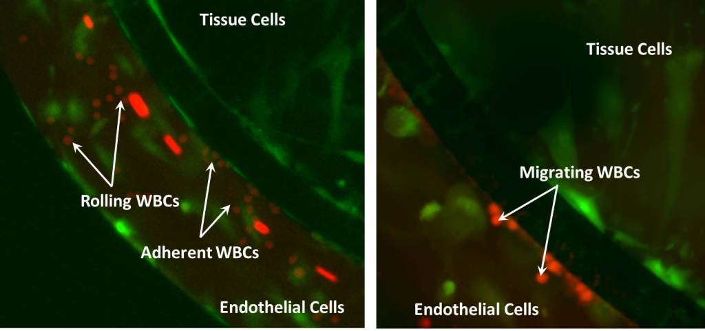 SynRAM microfluidic chips comprising of realistic microvascular networks were used to understand the role of classical inhibitors of individual steps of the leukocyte adhesion cascade. Experimental results matched very well with in vivo data highlighting the unique ability of the platform for real-time analysis of these dynamic events in a morphologically realistic environment (Lamberti et al 2014).