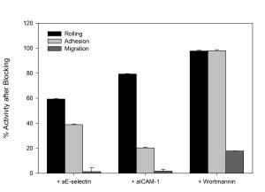 Antibody blocking of specific steps in the adhesion/migration cascade downregulates other steps of the cascade; Monoclonal antibodies against E-selectin (aE-selectin), ICAM-1(aICAM-1), and PI3K (wortmannin) significantly reduced the number of rolling, adhering, and migrating neutrophils in SynRAM microfluidic devices.