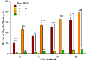 PKCδ-TAT inhibitor significantly reduces migration of neutrophils from the vascular channels, across the inflammed endothelium (treated with TNF-α for 4 or 24 hour), into the tissue compartment in response to fMLP mediated signaling compared to untreated controls.